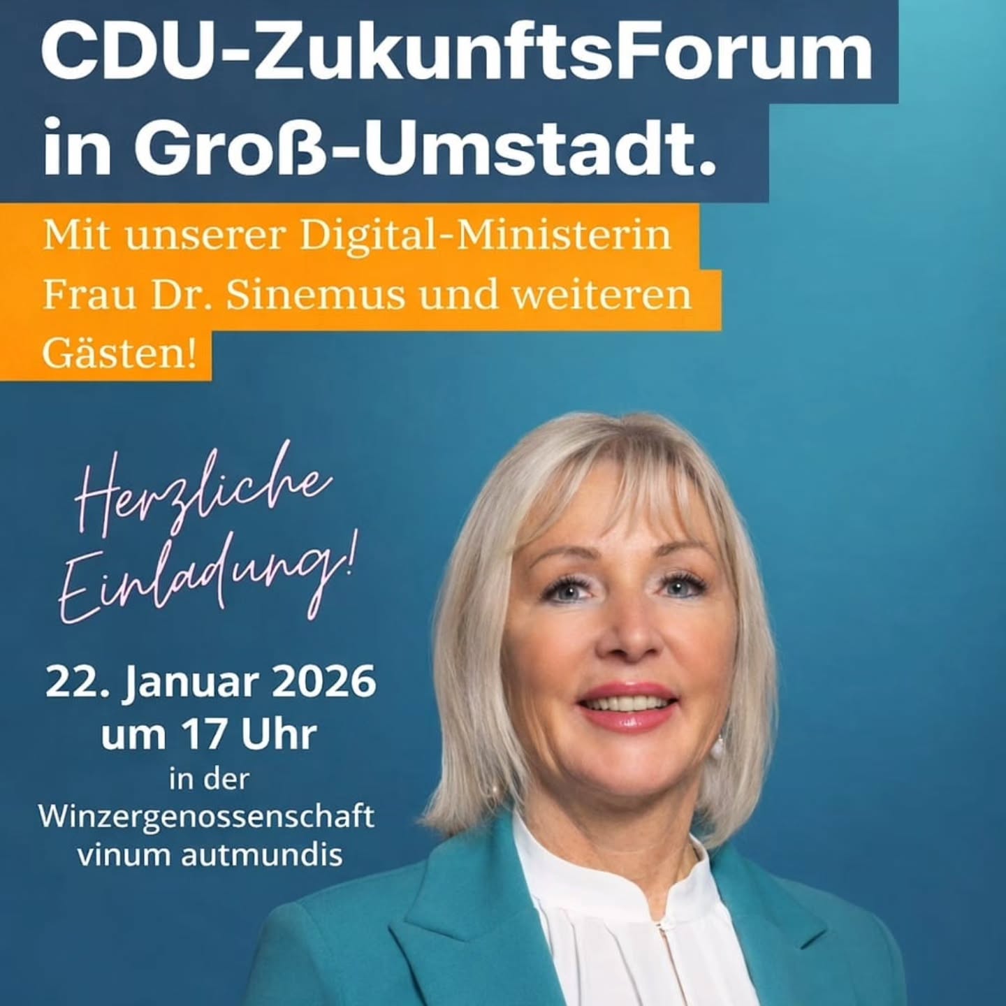 Groß-Umstadt. Modern. Zukunftsweisend & lebendig. Oder abhängt, pleite & verwaist?! Deutschland steckt mitten in einer digitalen Zeitenwende und zu viele Städte schauen tatenlos zu. Während weltweit Innovationen entstehen, Verwaltungen sich neu erfinden und Smart Cities Realität werden, kämpfen deutsche Kommunen mit kaputten Haushalten, Papierakten und strukturellem Stillstand. Die Frage, die wir uns in Groß-Umstadt stellen müssen, lautet deshalb: Gehören wir künftig zu den lebendigen Städten oder rutschen wir in die Liga der Abgehängten? Diese Frage stellen die Frauen der CDU Groß-Umstadt bewusst provokant. Denn Wegschauen hilft niemandem. Mutige Entscheidungen dagegen schon. Darum lädt der WomensCircle der CDU Groß-Umstadt alle Bürgerinnen und Bürger herzlich ein, am 22. Januar 2026 um 17 Uhr in der Winzergenossenschaft vinum autmundis gemeinsam über die Zukunft unserer Stadt zu diskutieren. Deutschlands erste Digitalministerin kommt nach Groß-Umstadt Dass wir für diesen Abend Prof. Dr. Kristina Sinemus, Deutschlands erste Digitalministerin, gewinnen konnten, ist ein Signal kein Zufall. Sie hat Hessen zum Vorreiter in Sachen Digitalisierung gemacht und wird offen darüber sprechen: Wo steht Deutschland wirklich? Was unternehmen die Bundesregierung und das Land Hessen? Und warum dürfen wir uns in den Kommunen nicht länger einreden, Digitalisierung sei "Neuland"? Ihre Botschaft: Wer Zukunft gestalten will, braucht Mut, Tempo und Haltung. Was passiert, wenn eine Stadt Digitalisierung ernst nimmt? Mit Dieter van Acken kommt zusätzlich noch einer der prägendsten Köpfe der Smart City Ahaus nach Groß-Umstadt. Er gewährt einen Blick hinter die Kulissen einer Stadt, die längst als Leuchtturm moderner Verwaltung und digitaler Transformation gilt. Er zeigt praxisnah, was möglich ist, wenn Kommunen nicht länger nur diskutieren, sondern machen. Sein Beitrag: konkret, überraschend, inspirierend. Die Generation, die es am meisten betrifft Zukunft ohne junge Menschen? Undenkbar. Darum nehmen an der Podiumsdiskussion u. a. Luis Anton Schwarz, Schulsprecher des Max-Planck-Gymnasiums, sowie weitere Vertreter*innen Groß-Umstädter Schulen teil. Ihre Haltung ist klar