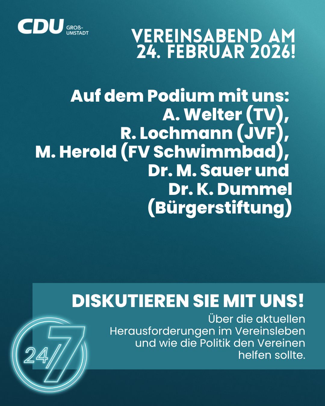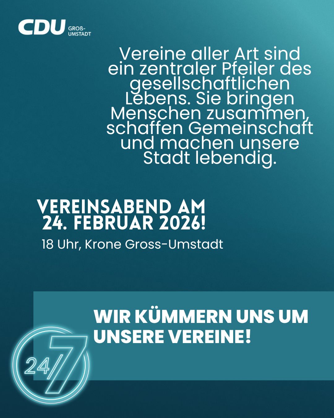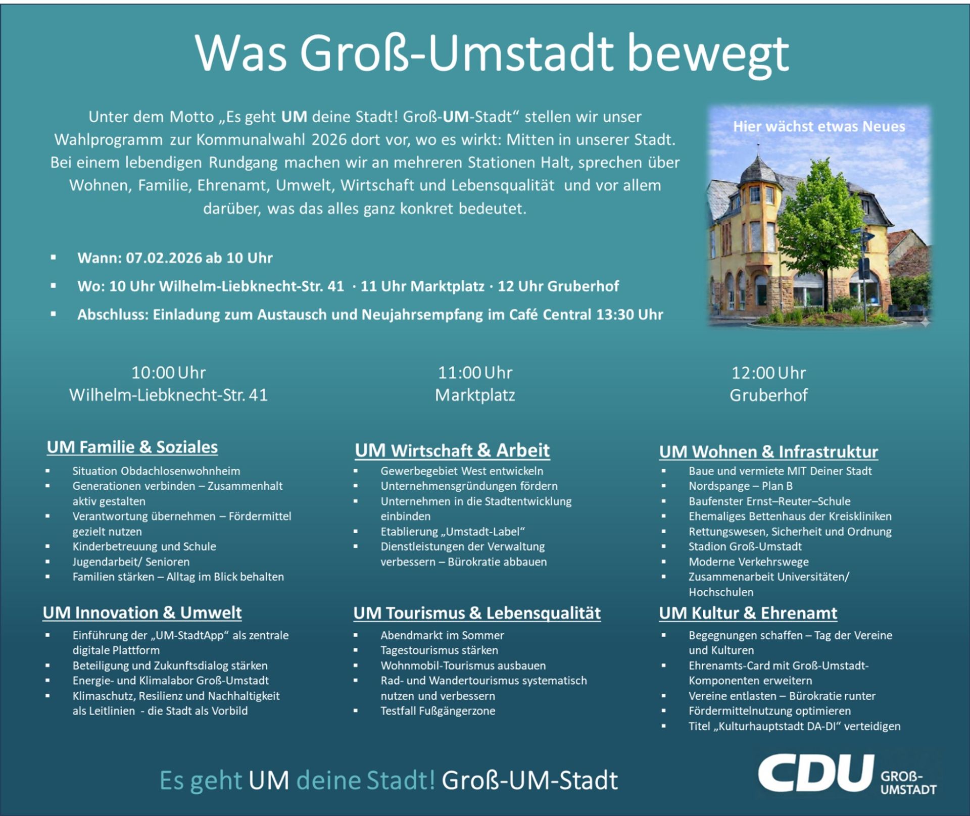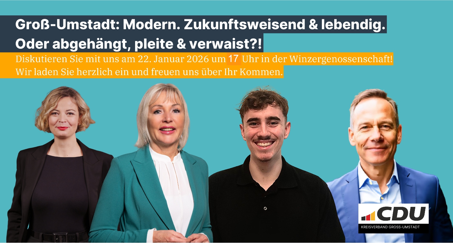 Darum lädt der WomensCircle der CDU Groß-Umstadt alle Bürgerinnen und Bürger herzlich ein, am 22. Januar 2026 um 17 Uhr in der Winzergenossenschaft vinum autmundis gemeinsam über die Zukunft unserer Stadt zu diskutieren.