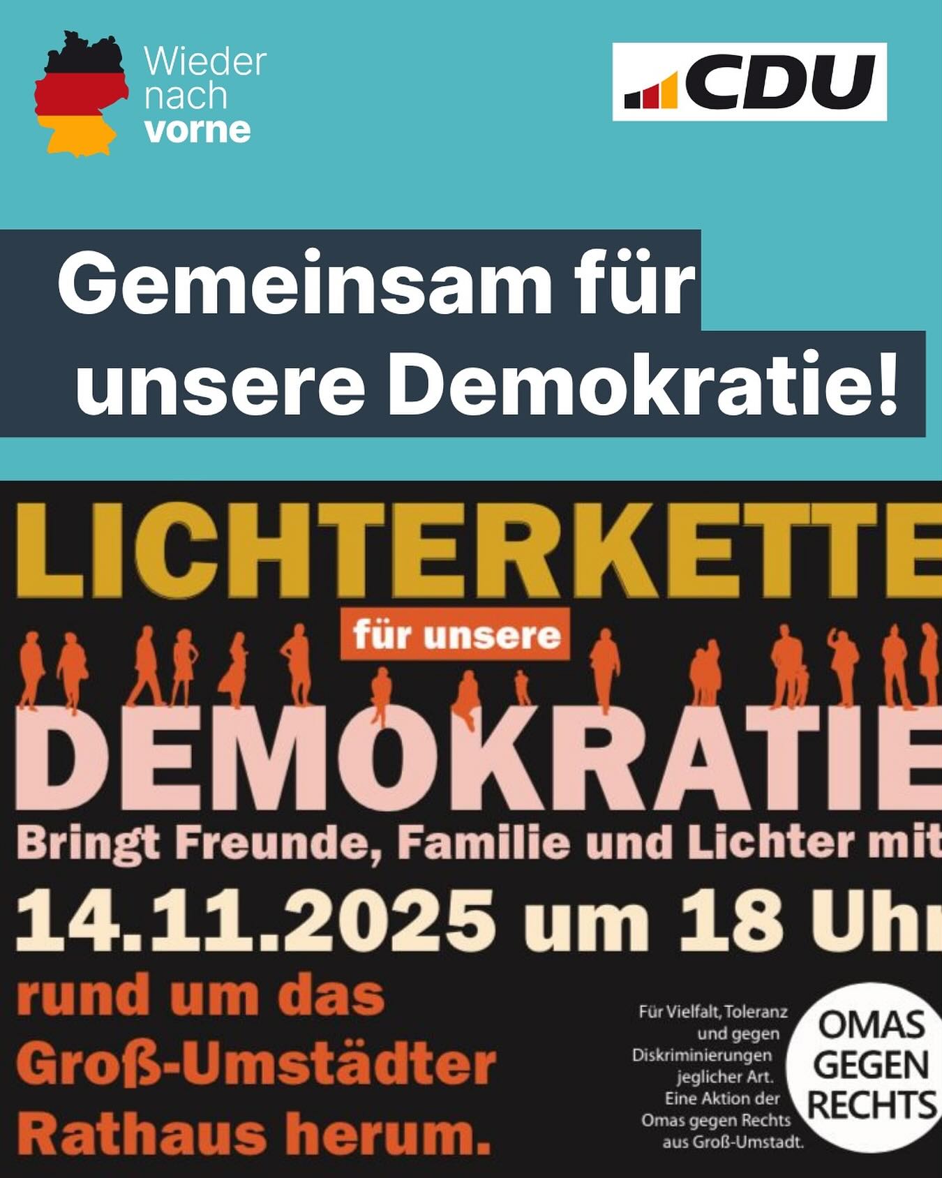mehrGemeinsam für unsere Demokratie! Wir unterstützen die morgige Lichterkette rund um das Groß-Umstädter Rathaus und freuen uns über alle, die ein Zeichen für Frieden, Vielfalt und Respekt setzen möchten. 🕯️ Bringt eure Lichter mit und kommt zahlreich ? 14. November, 18 Uhr. Jede Stimme zählt. Jede Präsenz macht stark. #Demokratie #Lichterkette #GroßUmstadt #Miteinander