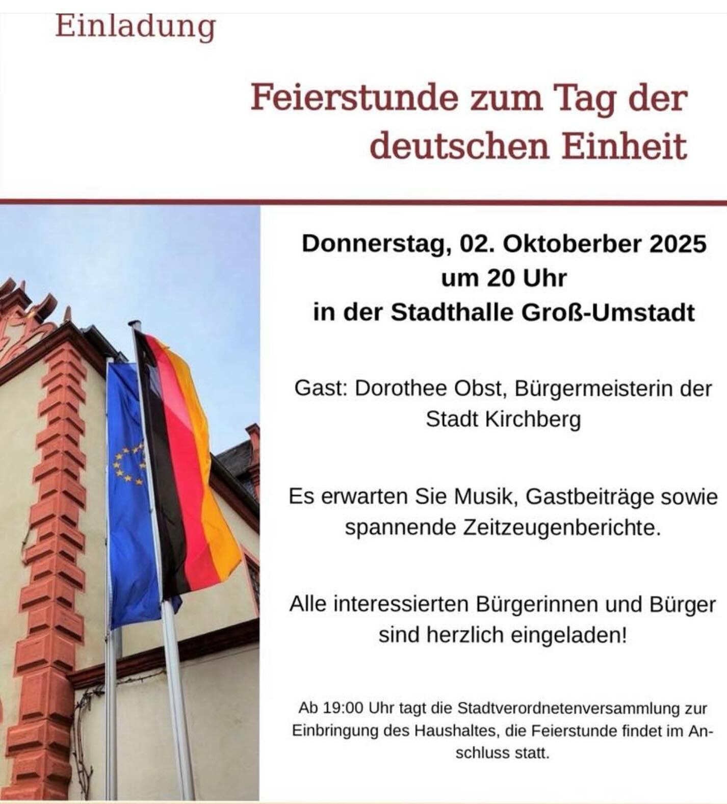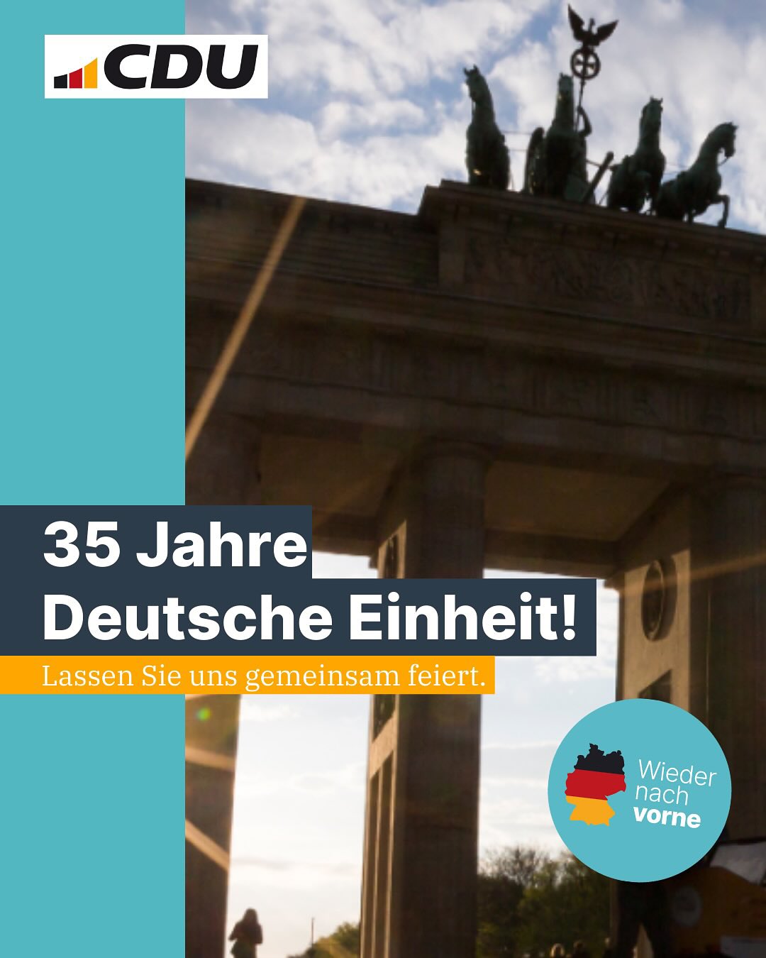 mehr35 Jahre Deutsche Einheit! 35 Jahre vereint. Und das mit einem friedlichen Übergang, was das schönste daran ist und war. Lassen Sie uns das gemeinsam feiern 🍾🥂 Denn selbstverständlich sind Frieden und Freiheit nicht. Wir laden Sie deshalb herzlich am ✨ 3. Oktober 2025 ✨ ab 14.30 Uhr ✨ in das Vereinsheim des TSV Richen ein! Eingeladen haben wir für Sie Leopold Born, Generalsekretär der CDU Hessen @leopoldborn und Lutz Köhler, 1. Kreisbeigeordneter des Landkreises Darmstadt-Dieburg @lutz.koehler Natürlich ist für leckere Speisen und Getränke gesorgt und eine Hüpfburg steht für unsere kleine Gäste auch bereit. Wir freuen uns auf Sie und einen schönen Nachmittag mit Ihnen. #einladung #deutscheeinheit #35jahre #gemeinsam #gemeinsamfeiern #feiern #cdu #cduhessen #grossumstadt #grossumstadt
